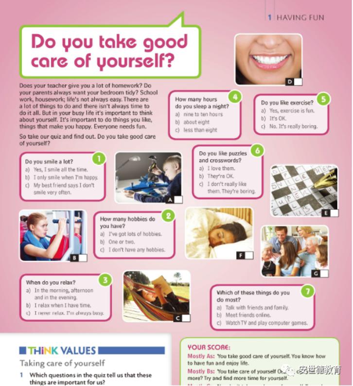THINK,不仅仅是语言教学,它包含思考、身心健康、理想、兴趣和幸福,我们现在不是提倡“双减”嘛,它更大的意义在于不以考试或分数为目的,而是培养有自己兴趣的、身心健康的青少年。这些,我们在Think里可以找到更多。比如“Do you take good care of yourself ? ” “Music” "Sports” 。